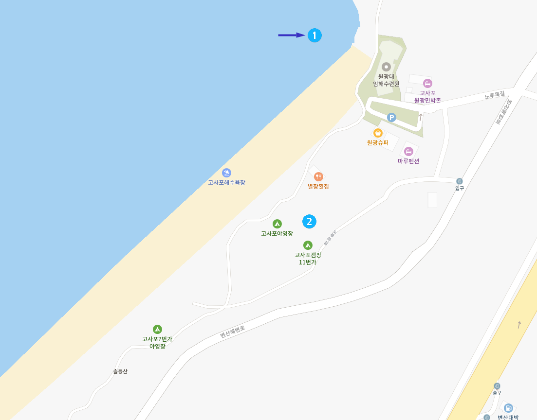 고사포 야영장의 특장점은 바로 뒷편에 50m 거리도 되지 않는 곳에 바로 고사포 해수욕장이 위치한다는 점입니다. 해수욕장에 입장할 때는 정문에서 열을 재고 이름을 적어야해서 정문을 이용해야하지만 나무들 사이에 위치한 캠핑장 바로 뒷편에 해수욕 및 해루질이 가능한 해수욕장이 있다는 것은 정말 특장점입니다. 고사포해수욕장 아래쪽으로 해서 격포항이나 채석강, 변산해수욕장 등 많은 물놀이를 할 수 있는 곳이 있지만 고사포의 경우 야영장이 큰 장점이 아닐까싶습니다. (만일 격포 해수욕장을 이용하실 계획이라면 차라리 소노벨 변산 이용을 추천드립니다.)